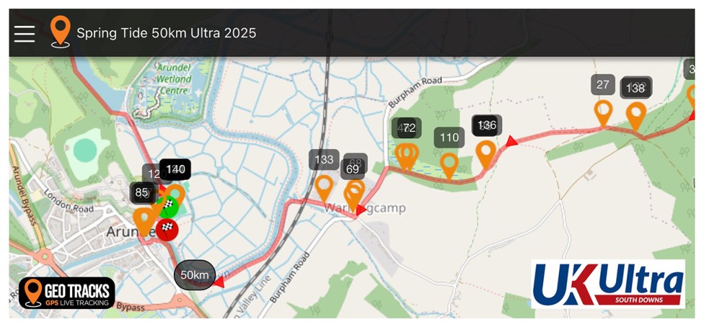 From here, beyond 24 miles, the course turned west towards home. The breeze died and I was dropping from the heights of the South Downs Way. Yet, the ‘mostly downhill’ turned out to be undulating. I was alone again. Those ahead would stay ahead, and I could see no one behind. There was quite a sting in the tail. At Michelgrove was a very steep climb up into Angmering Park. My tired thighs were numb by the top, so I resigned myself to finishing well outside 7½ hours. There was no point in pushing harder. The 100k was more important. Through the trees – 29 miles, 30 miles, then down to the level ground of the Arun River valley. Over the railway and I turned to shuffle along the riverbank. At 31 miles I looked back – a young couple were jogging, trying to catch me! They must have made up half a mile on me since the aid station! I turned and fled! Well, broke into a slow run at about 11:00 mile pace. I learnt later they stopped and walked once they saw me start running faster. They were more tired than me, but I had, at least, dragged them along to a faster time. I’m an easy target in my yellow kit!